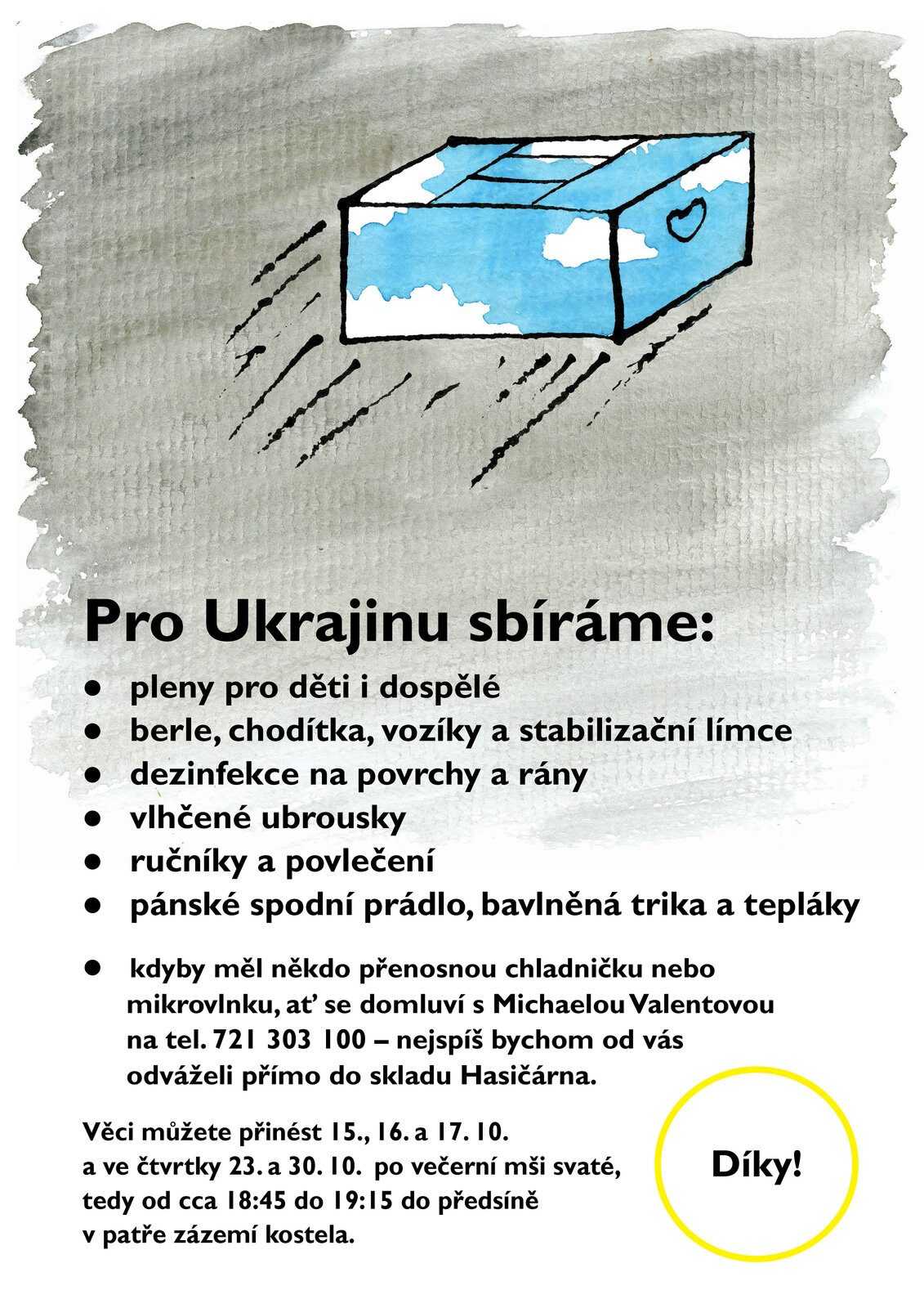 Zpracování obvazů pro Ukrajinu pokračuje zase od září 2025. Na nástěnce v kostele Nejsvětějšího Srdce Páně jsou aktuální informace. Kdo nemůže ve čtvrtek a pátek, mohl by se některé pondělí zajít podívat do refektáře Panny Marie Sněžné (vchod z Františkánské zahrady). Obvykle tam pracují v pondělí odpoledne, více informací na fb Síma Last.